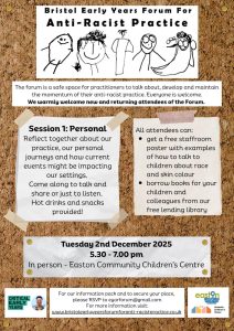 Bristol Early Years Forum For Anti-Racist Practice Develop your anti-racist practice in early years – everyone is welcome. Free to attend Tuesday 02/12, 5.30- 7.00pm Easton Community Children’s Centre RSVP: eyarforum@gmail.com https://www.bristolearlyyearsforumforanti-racistpractice.co.uk/...